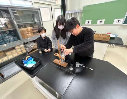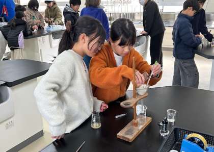 5年生がろ過の仕方を学習しました。ろうとの先をビーカーの壁につけ、液はガラス棒に伝わらせて注ぎました。砂が混じった液を上手にろ過できました。