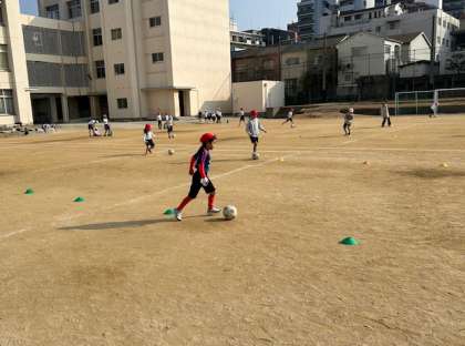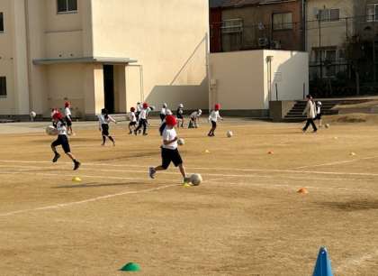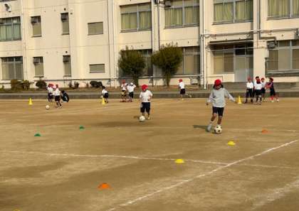 2年生が体育「ボール遊び」をしました。サッカーボールをジグザグにドリブルしました。最初はボールをけりすぎて、なかなかうまくできませんでしたが、段々とボールと足があまり離れずにドリブルができるようになりました。