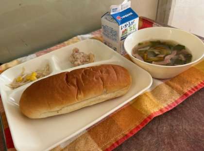 献立は、鶏肉のからあげ、ハムと野菜の中華スープ、もやしとコーンの中華あえ、おさつパン、牛乳です。