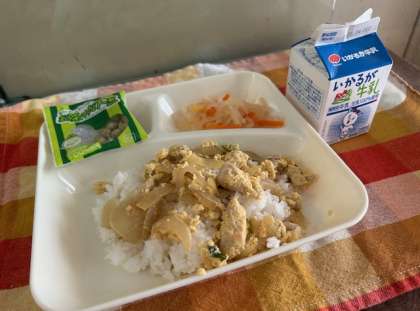 献立は、親子丼、紅白なます、まっ茶大豆、ご飯、牛乳です。