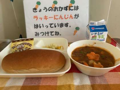 献立は、ビーフシチュー、カリフラワーとコーンのサラダ、カレーフィッシュ、黒糖パン、牛乳です♪ビーフシチューにはラッキーにんじんが入ってます。見つけたかなあ。