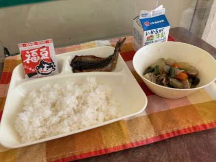 献立は、いわしのしょうがじょうゆかけ、含め煮、いり大豆、ご飯、牛乳です。