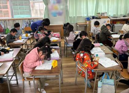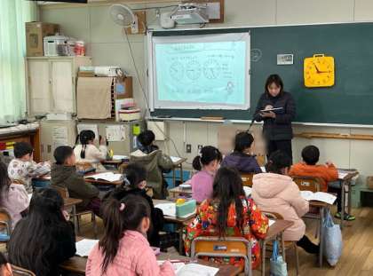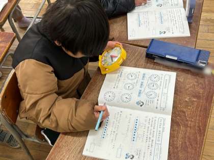 1年生が算数「なんじなんぷん」の学習をしました。模型の時計を使って長い針と短い針を動かしながら、問題を解きました。