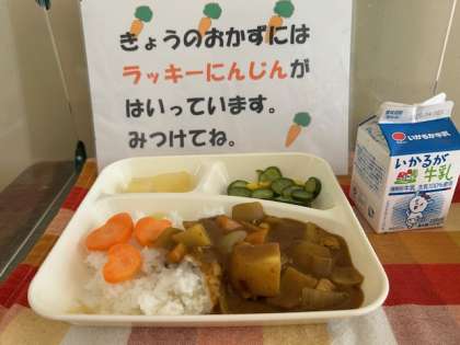 献立は、チキンレバーカレーライス、きゅうりとコーンのサラダ、洋なしの缶詰、牛乳です。ラッキーにんじんが入っていたかなあ。