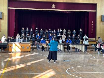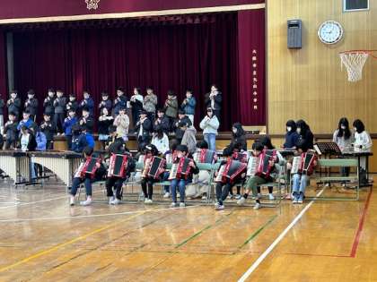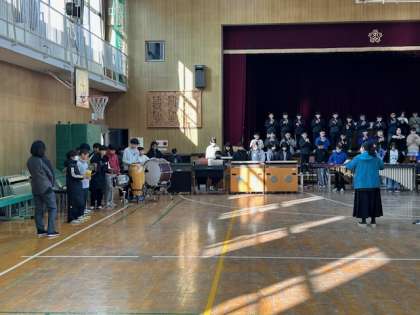 5年生が体育館で音楽の合同練習をしました。学習参観で行う合奏を練習しました。打楽器、アコーディオン、リコーダーなど、それぞれ担当する楽器を演奏して合わせました。