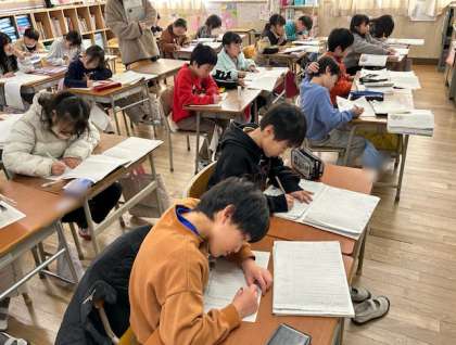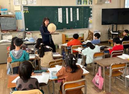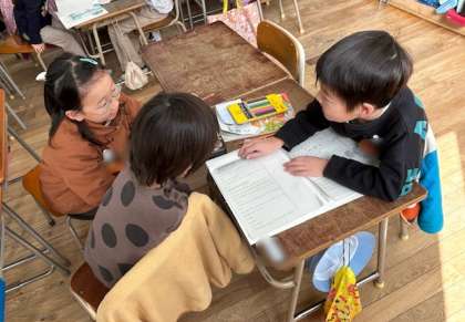 2年生が国語「かさこじぞう」を学習しています。一人学びができるように本文を場面ごとに一枚の用紙にまとめ、赤や青でサイドラインを引きます。授業の終わりには振り返りとしてワークシートに、今日の学習でわかったことや思ったことを手紙形式でまとめます。今日は、「ばあさまはどんなところがやさいのだろう」を学習課題として、自分の考えを伝えて話し合う活動をしました。