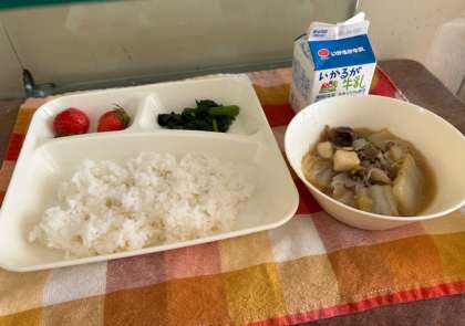 献立は、すき焼き煮、ほうれんそうのおひたし、いちご、ご飯、牛乳です。