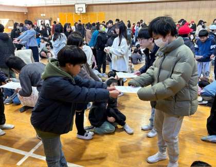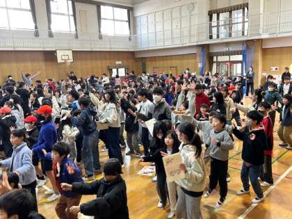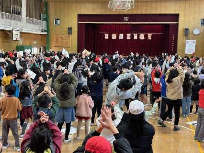 スマイル班の6年生に卒業のお祝いや感謝の気持ちを書いたメッセージカードを渡しました。次に、全校児童で校歌とパプリカを歌いました。パプリカは踊りながら歌いました。みんなの歌声が体育館に響き渡りました。