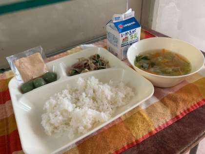 献立は、豚肉と野菜のいためもの、五目汁、よもぎだんご、きな粉、ご飯、牛乳です。