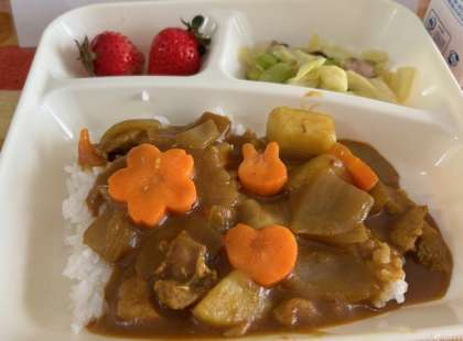 カレーライスにはラッキーにんじんが入っています。ハート、さくら、うさぎの形をしたにんじんを探しながら、おいしく給食をいただきました。給食調理員さん、ありがとうございました。