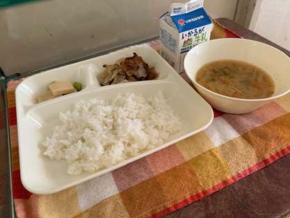 献立は、豚肉のしょうが焼き、みそ汁、高野どうふの煮もの、ご飯、牛乳です。