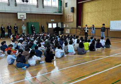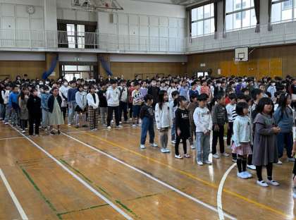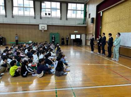 本校に着任した教職員の挨拶、6年児童代表の発表、最後にみんなで校歌を歌いました。