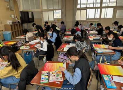 1組は図画工作担当の先生の指導のもと、夕焼けの風景を描きます。今日は夕焼け空を赤、オレンジ、黄色の3色を使って描きました。