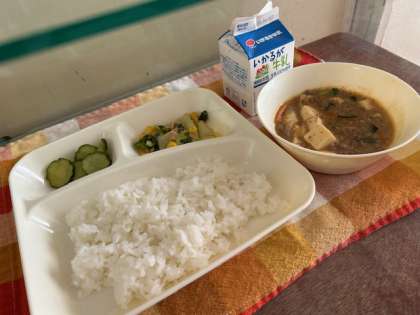 献立は、マーボーどうふ、きゅうりの中華あえ、ツナとチンゲンサイの炒めもの、ご飯、牛乳です。