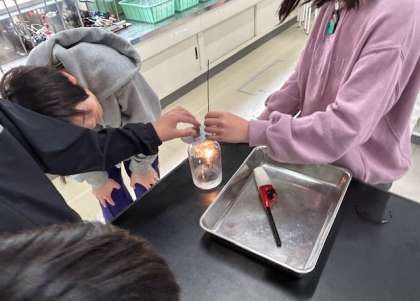 6年生が理科「気体を入れたびんの中でろうそくの燃え方を調べよう」を学習しました。酸素、ちっ素、二酸化炭素中での燃え方を実験しました。