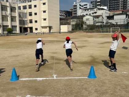 5年生が体育で50m走のタイムを計測しました。スタートは低い姿勢から飛び出し、まっすぐ見て、ひじを後ろに引っ張るように腕を振りました。ゴールを突き抜けるように最後まで全力で走りました。