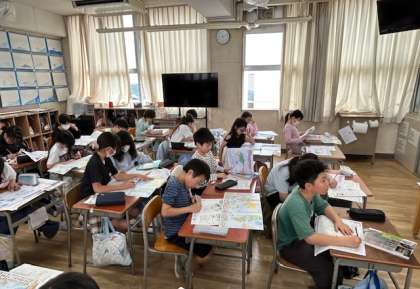 社会科「世界の中の国土」の学習で、世界の国、大陸、海洋などを地図帳を使って調べました。