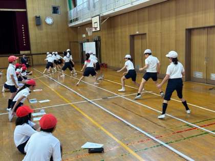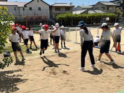5年生が体育館では反復横跳び、砂場では立ち幅跳びをしました。