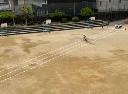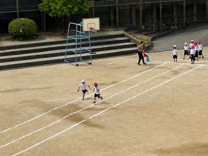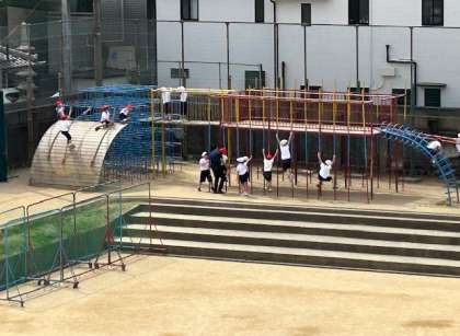 1年生がスポーツテスト50m走を計測しました。待っている間は、固定施設を使った運動遊びをしました。