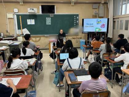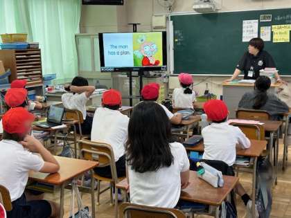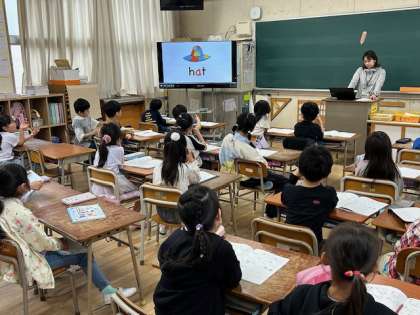水曜日の朝はイングリッシュタイムです。週に2回、1回10分間で行います。年間で約12時間がイングリッシュタイムで、英語にふれあう活動をします。