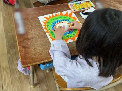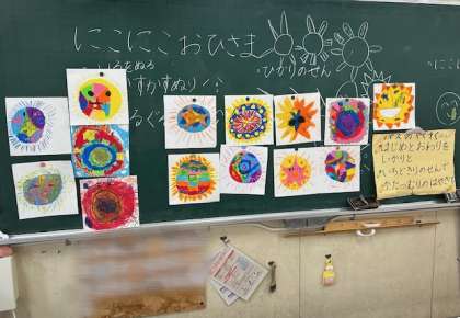 図工は、パスで「にこにこおひさま」を描きました。パスの約束を学んだ後、カラフルなにこにこおひさまができあがりました。