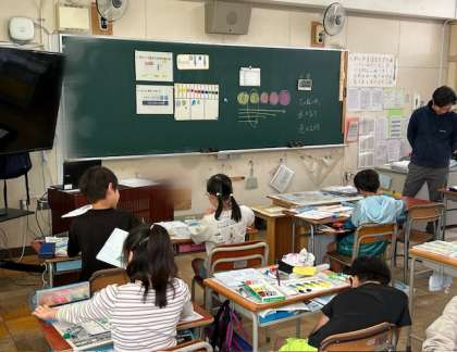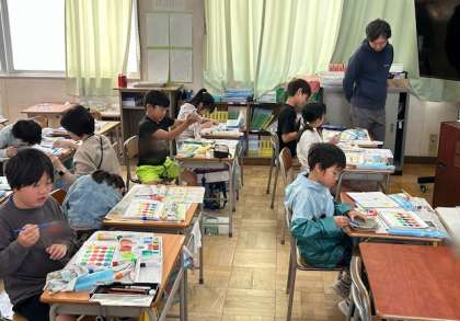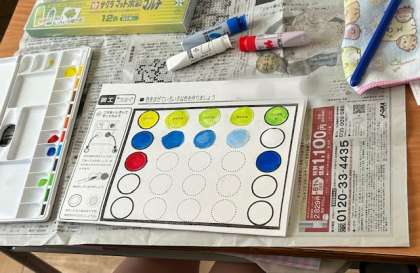 3年生が絵の具の使い方を学習しました。机の上でのパレット、バケツ、画用紙、ぞうきんの置き方、水入れ(筆洗)の使い方、筆の水分量などを学びました。その後、色を混ぜて色々な色を作りました。