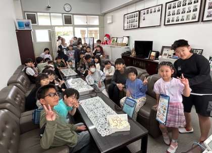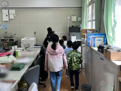 1年生が6年生といっしょに学校たんけんをしました。理科室、保健室、音楽室、なかよし教室、図工室、家庭科室、校長室、職員室など、たくさんの教室を6年生の案内で見てまわりました。校長室ではソファに座って校長先生からの説明を聞きました。また、職員室にも入って先生たちの仕事場の様子を見ました。