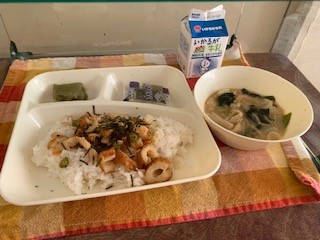 献立は、かやくごはん、みそ汁、抹茶ういろうです。