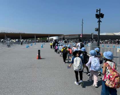2年生は、大阪・関西万博へ行きました。学校を8時50分に出発し、10時前に、夢洲駅に到着しました。夢洲駅の広い階段を上がり、東ゲートの団体入場口へ行きました。スムーズに入ることができました。