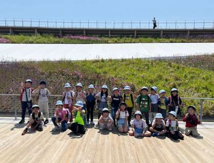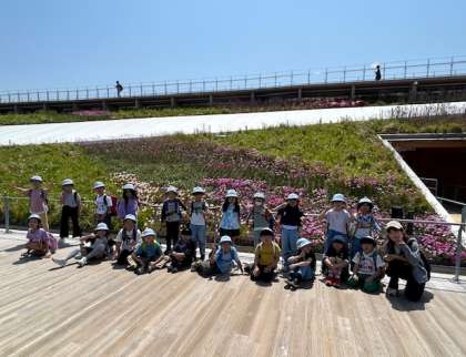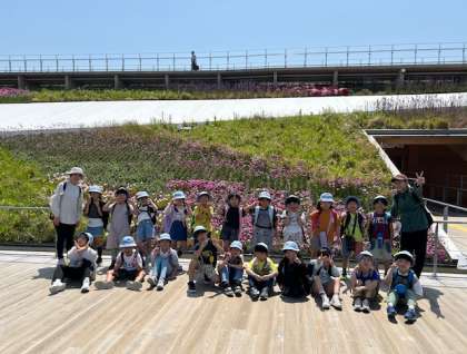 大屋根リングの上で記念撮影をしました。きれいな草花と大屋根リングを背景にして撮影しました。