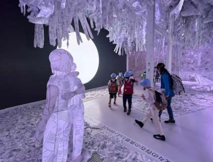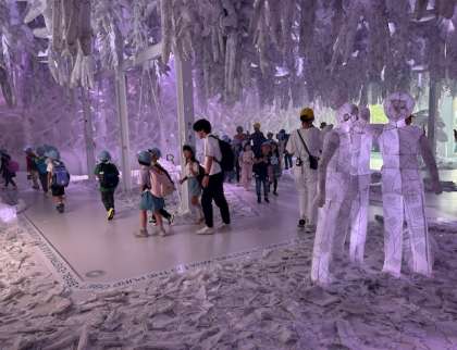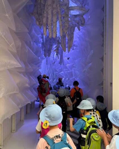 天井からつり下がるような植物のオブジェ、ポリ袋をリサイクルして作った人のオブジェが立っていました。その中を通りました。不思議な空間です。