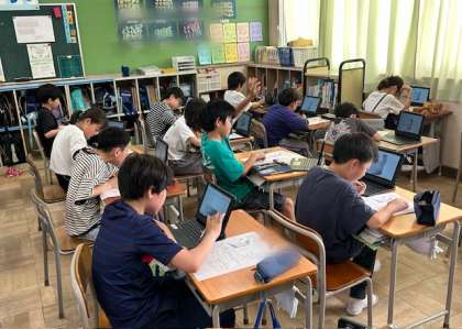 社会科「大阪府の様子」の単元テストをしました。大阪府の地形図をタブレット端末に取り入れ、それを見ながらテストに取り組みました。