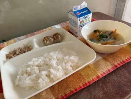 献立は、焼きシューマイ、鶏肉とはるさめのスープ、ツナともやしのいためもの、ご飯、牛乳です。