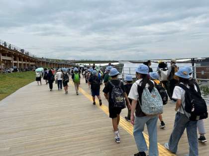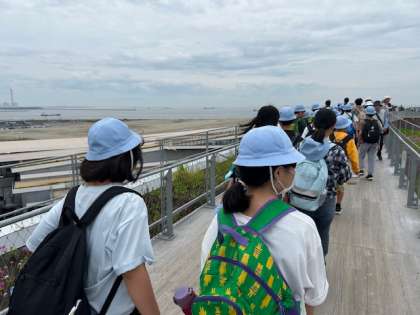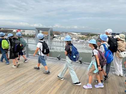大屋根リングにあがり、各国のパビリオンや海をながめました。