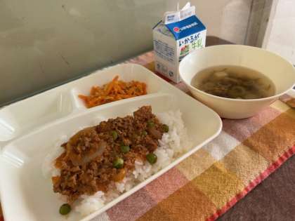 献立は、タコライス、とうふともずくのとろり汁、にんじんしりしり風、ご飯、牛乳です。