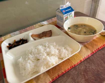 献立は、あかうおのしょうゆだれかけ、みそ汁、ひじきのいため煮、ご飯、牛乳です。