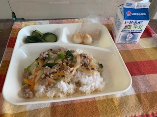 今日のメニューは、「豚どんぶり」「きゅうりのかつお梅風味」「白玉だんご」です。