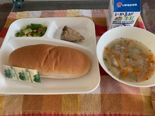 今日の給食メニューは、かつおのガーリック焼き、押し麦もスープ、グリーンアスパラガスのソテー、コッペパン、、マーガリン、牛乳です。