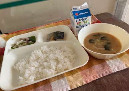 献立は、さごしのおろしじょうゆかけ、みそ汁、野菜いため、ご飯、牛乳です。