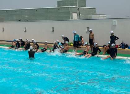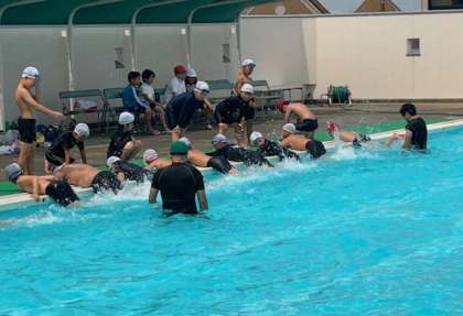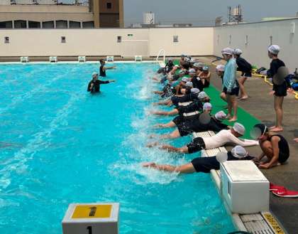 プールサイドに腰をかけて、バレリーナの足の形でキックの練習をしました。また、プールサイドに腹ばいになり、膝を伸ばしてばた足の練習をしました。どちらもバディのメンバーで、できばえを確認してアドバイスをしました。