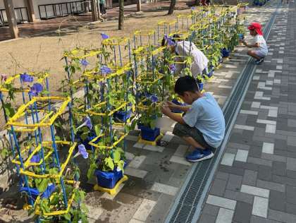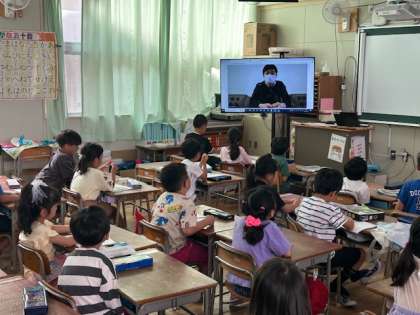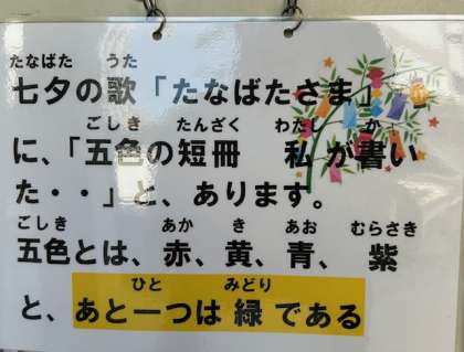 登校後、1年生はあさがおの水やりをしています。今日も暑いです。予報では最高気温が38度です。日差しも強いため、児童朝会は教室で行いました。校長先生からは、七夕のクイズがありました。「短冊に願いごとを書いて終わりにするのではなく、願いごとが思いついたら、その願いごとが実現できるように、何をしたらいいか考え、実行することが大切です」と、お話がありました。