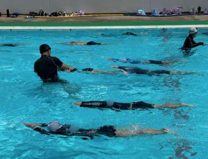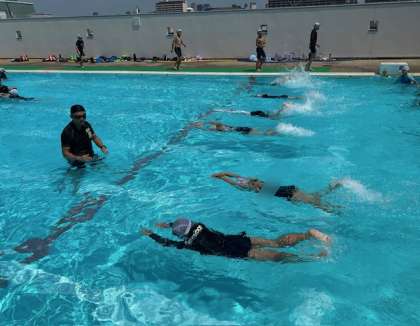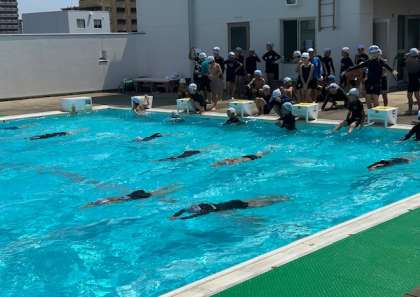 4年生は、25mプールの縦を使って、けのびとばた足の練習をしました。音楽に合わせて泳ぎました。