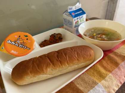 献立は、かぼちゃのミートグラタン、スープ、みかんゼリー、おさつパン、牛乳です。