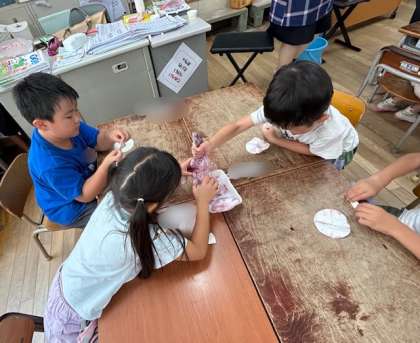あさがおの花を袋に入れ、少しだけ水を入れ、袋の上からもみもみしました。出てきたいろみずをカップにうつし、紙を折っていろみずにつけて染めました。紙を広げるときれいに染まっていました。