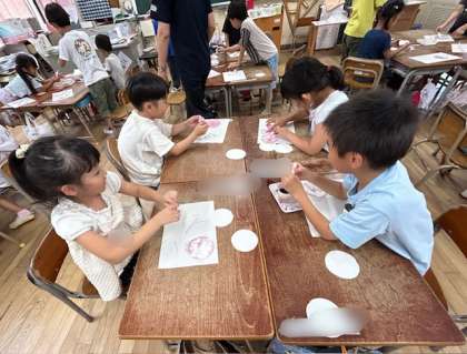1年生が育てているあさがおの花を使って、いろみず遊びをしました。