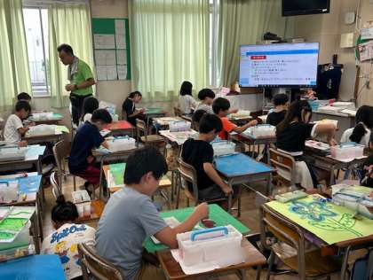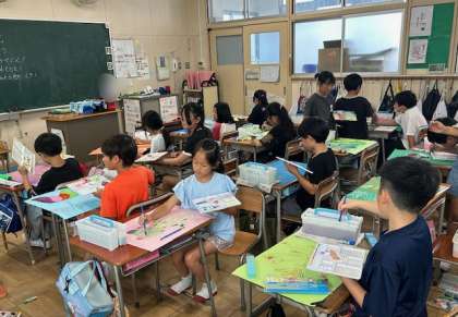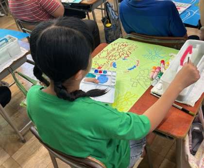 4年生が「ふしぎな花」を描いています。自分のイメージに合った色画用紙を選び、クレパスで不思議な花を描きました。今日は色づけをしました。