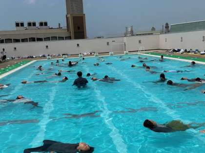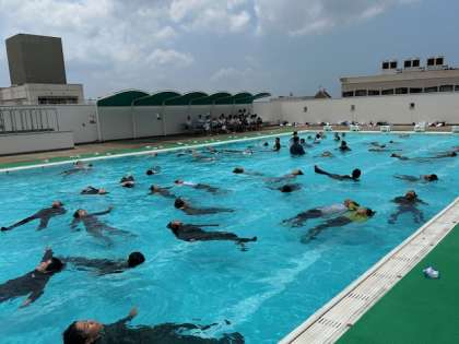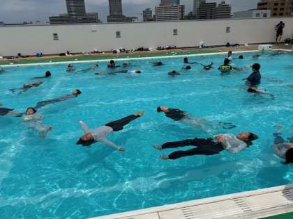 6年生が川や海、プールでの危険性を理解し、安全な行動をとることができ、いざという時にあわてないで余分な体力を使わない浮き方や泳ぎ方を身につけるために着衣泳をしました。ペットボトルをどのように持つと長く浮けるかを体験して、その後、3分間浮くことに挑戦しました。上手に長い時間浮くことができました。