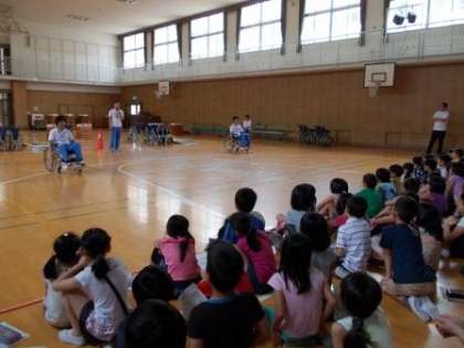 6月3日(月)に大阪市立障がい者リハビリテーションセンターの方に来ていただき、車いす体験を行いました。普段乗ることのない車いすについて学習しました。自走体験と介助体験を通して、乗っている人の気持ちを考えたり、介助の時の注意点などを考えることができました。