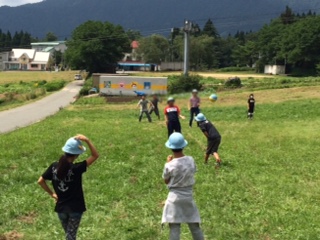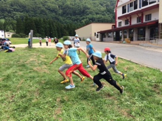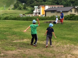 > 活動班で自分たちで考えた遊びをしています。高原での最後の活動です。みんな元気に遊んでいます。