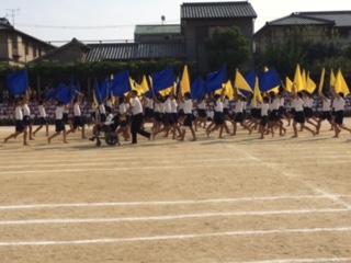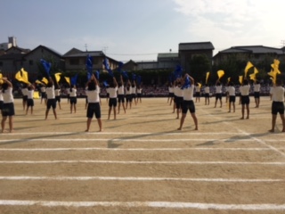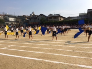 6年生は絆をテーマに、フラッグを使った演技と組体操を組み合わせて取り組みました。